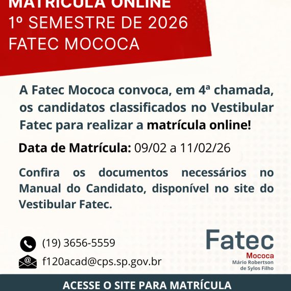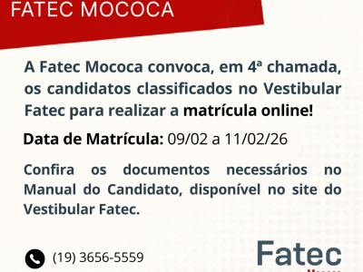 A Fatec Mococa convoca, em 5ª chamada, os candidatos classificados no Vestibular Fatec para realizar a matrícula online pelo site: