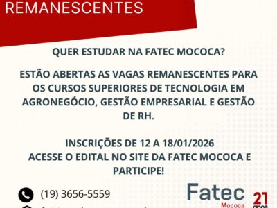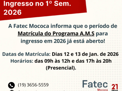 Os horários de aulas do 1º semestre de 2026 já estão disponíveis no site da Fatec Mococa! 👉 Acesse: www.fatecmococa.cps.sp.gov.br (menu Horários de Aulas) 📲 Ou escaneie o QR Code / acesse o link: bit.ly/calendario1sem2026-fatecmococa […]