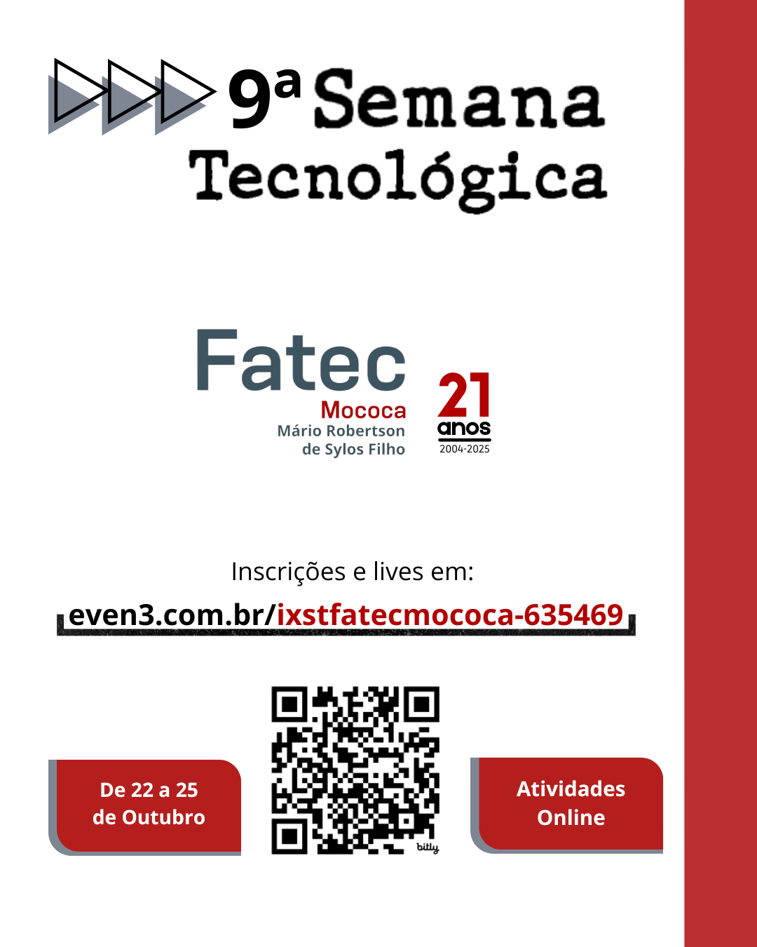 A Fatec Mococa convida toda a comunidade para participar da IX Semana Tecnológica, realizada de 22 a 25 de outubro, juntamente com o Ideathon Fatec Mococa 2025! 🌟